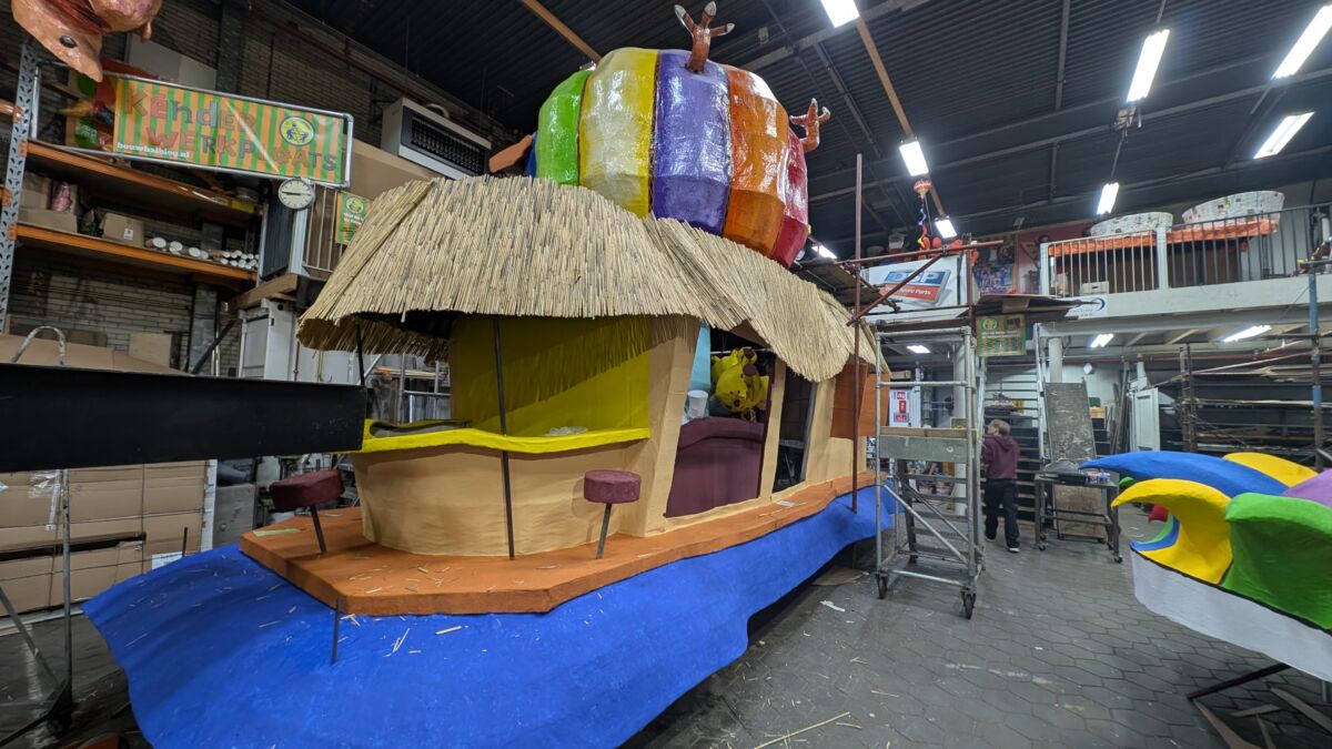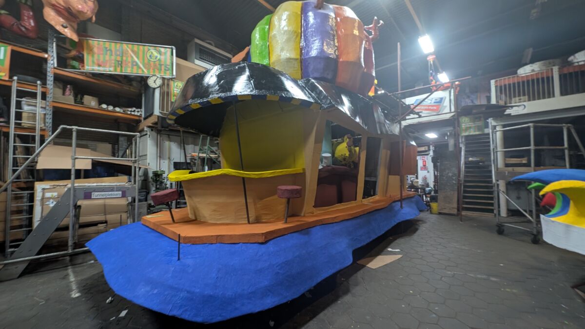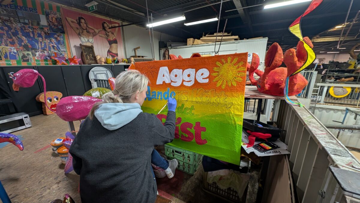 Zoë heeft zich ontfermt over de vlag die boven op het hutje komt te staan.. dat wordt een pareltje! Én hierop is ons motto van de wagen van dit jaar te zien: Agge aanders kèkt, Ziedet Bist!