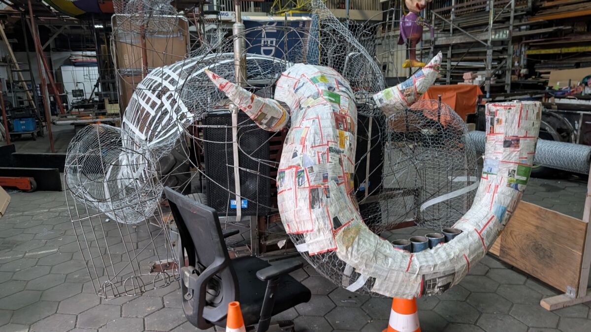 Daarna stond er weer een gewone bouwavond op de planning: De olifant is bijna helemaal ingepakt in het gaas en karton en de plakkers zijn zelfs al begonnen met het inpakken van de slurf en slagtanden.