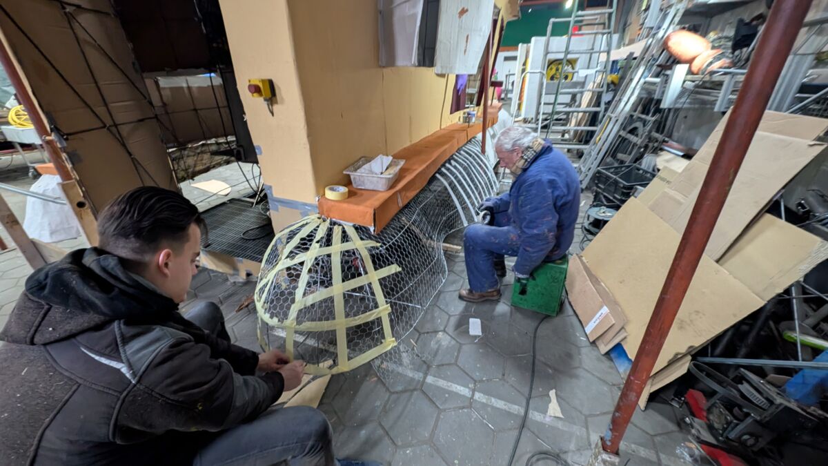 Maandagavond…. Bouwavond! Met een mooie club bouwers zijn er veel “laatste dingen” gedaan. Het laatste gaaswerk is gedaan. Het laatste kartonwerk is gedaan en bijna: het laatste werk op de steiger is gedaan. En dat is maar goed ook want we hebben nog maar 19 te dagen te gaan tot d’n Opstoet. 2 van de Daltons hebben het zwarte dak in de lak gezet. Hier gaat later vandaag het riet op zodat dit komende week op kleur gespoten kan worden.