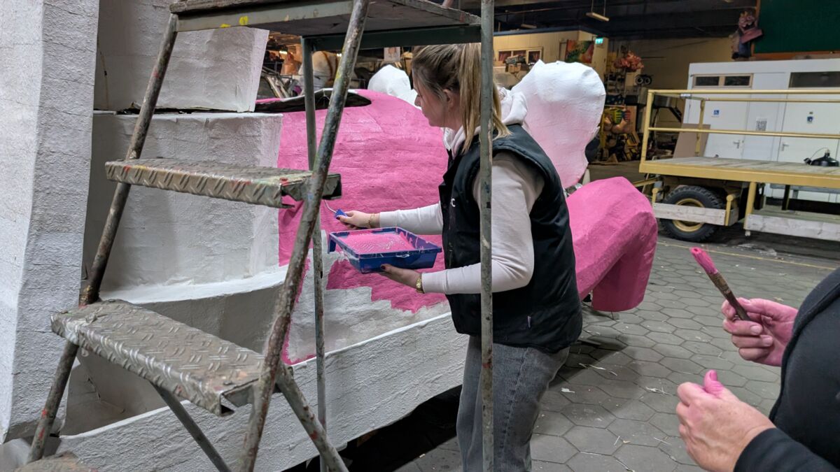 De trekker zit voor 98% in het papier! nog wat kleine puntjes op de palmboom en dan zit hij dicht. Er is ontzettend veel werk verzet door Wil, Koosje, Mieke om dit voor elkaar te krijgen. Inmiddels hebben Tante Tilly en Lisa de eerste verf op onze roze olifant gezet.